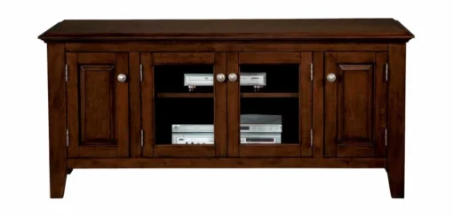 The Vineburg 60” console features two open compartments at top, two doors with one adjustable shelf behind each door, center compartment has one adjustable shelf, grommets for wire management. Multi-step hand applied storm finish. Straight framed molding doors, canted foot base. Cutouts for component cables. Dark antique brass square knobs.