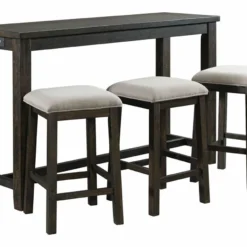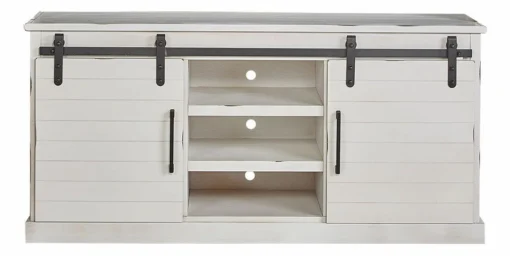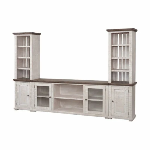 Crafted with pine solids and veneers, the Diego 62″ three piece rustic style entertainment wall features a hand applied two tone finish with a taupe top and an antique white base. The console is configured for easy wire management to accommodate any combination of electronic devices. Side piers complete the unit with more shelves for display and all pieces are equipped with levelers for perfect alignment. Matching tables also available.