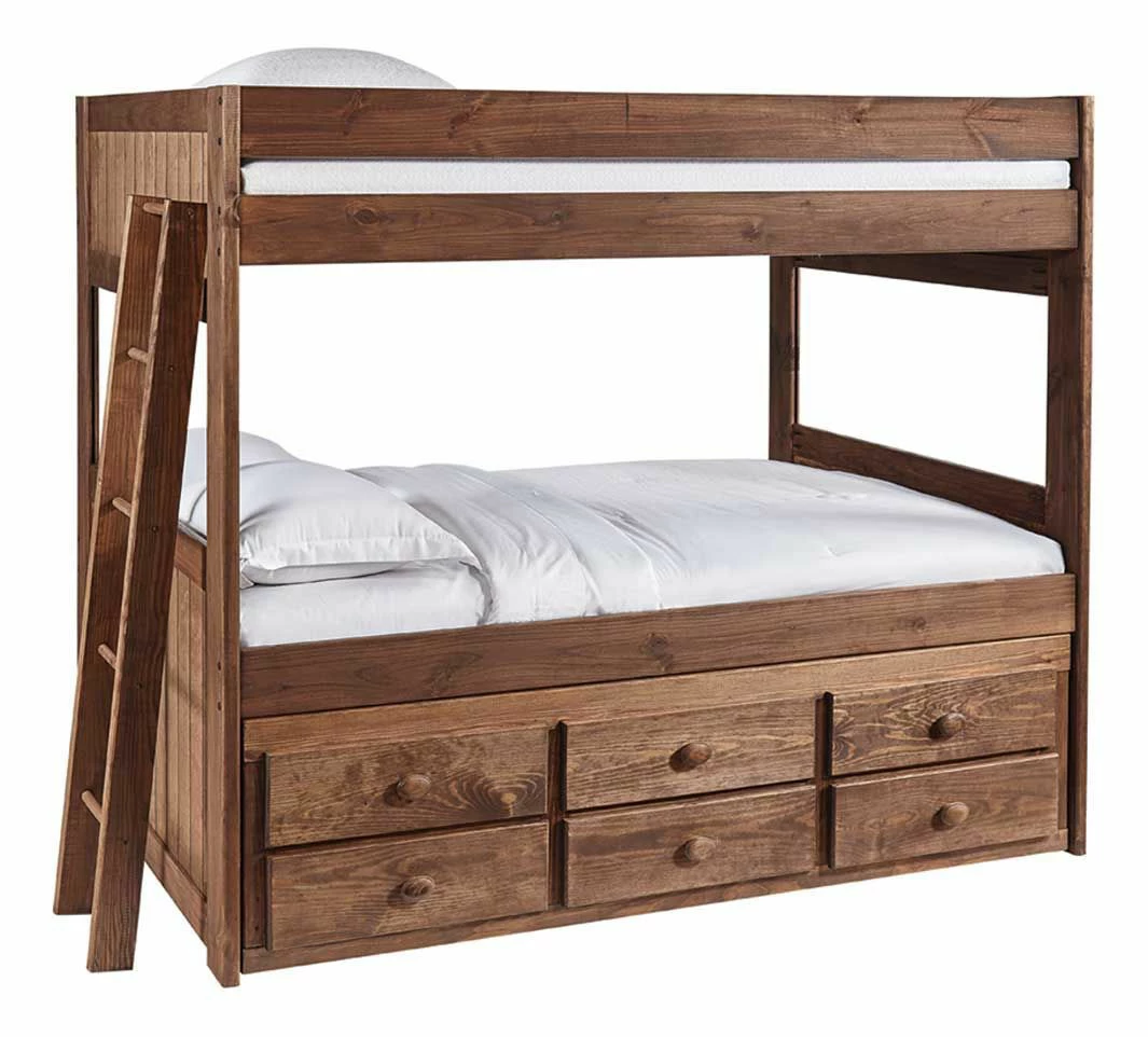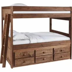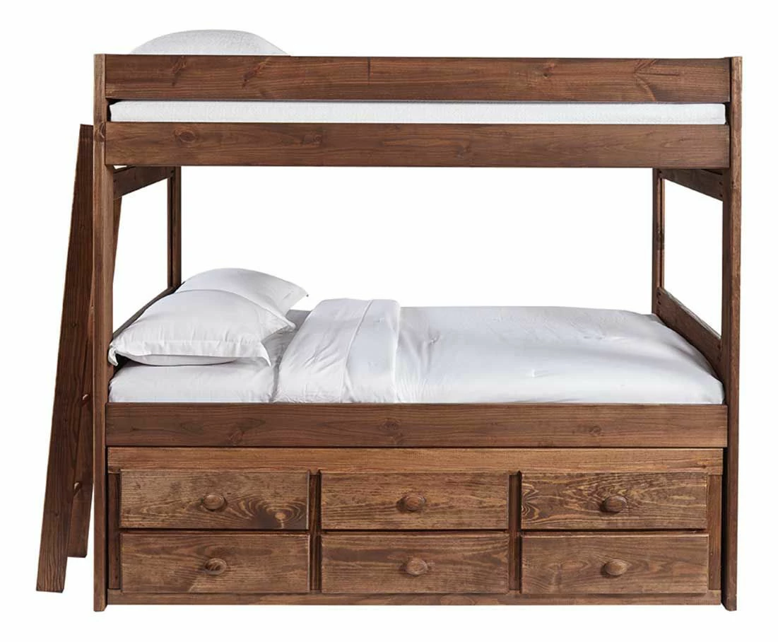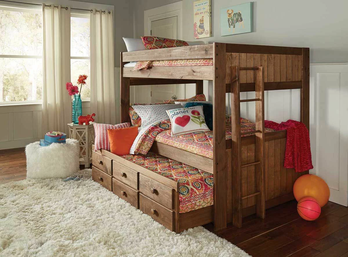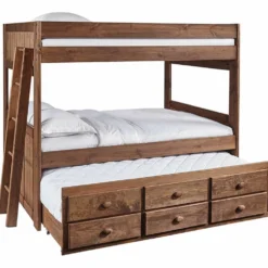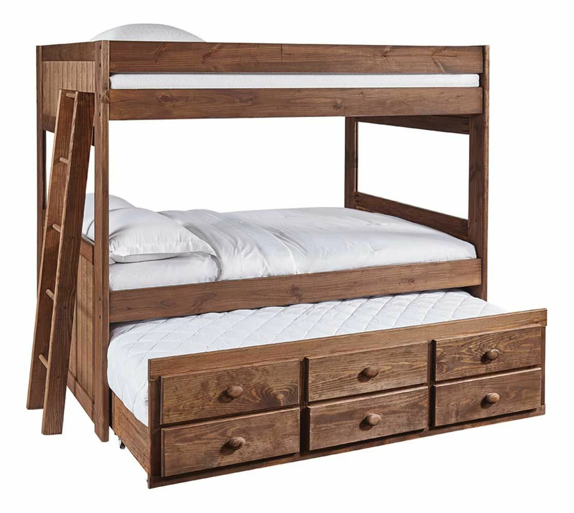 Be ready for sleepovers and guests when you purchase this rustic and stylish complete full bunk bed with trundle from the Baylee Collection. With a gorgeous dark wooden finish, this piece will fit with any existing décor. Add this classic, high-quality bed to your child’s room and transform their room into a beautiful retreat.