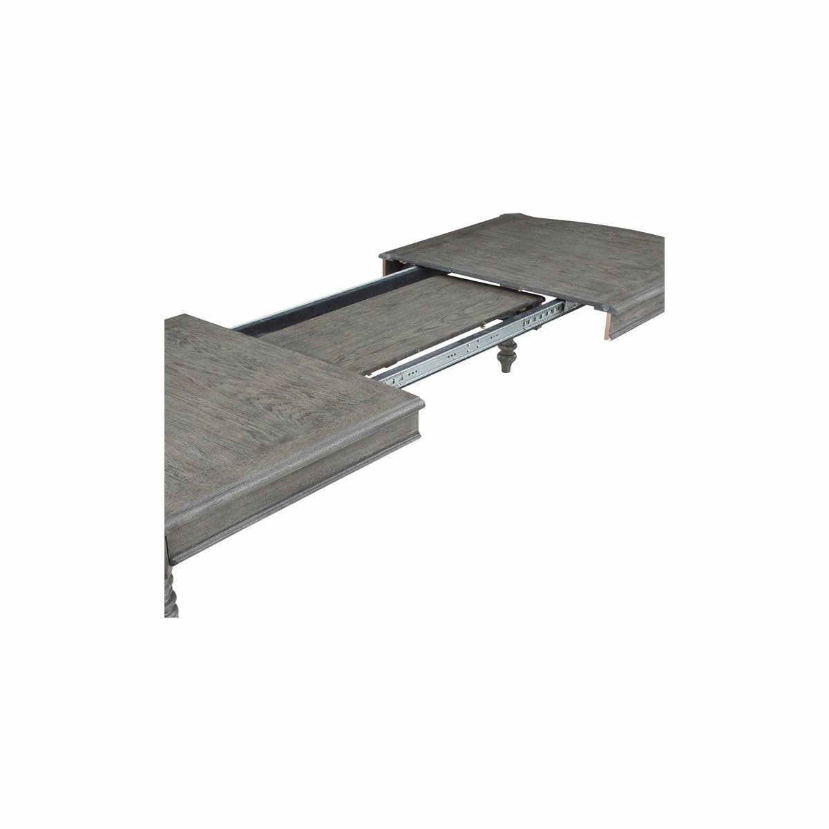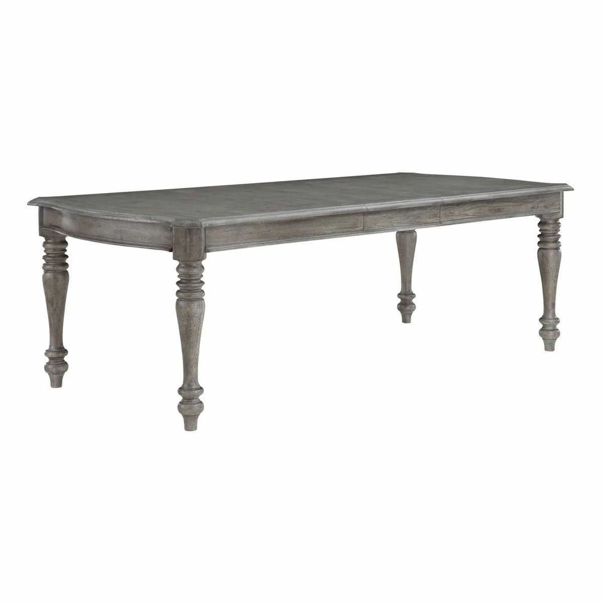 Traditional leg dining set constructed out of solid rubber wood/acacia with pecan veneers in a sandblasted grey finish. Rectangular leg table is 44″ wide, 73.75″ long and will extend to 91.75″ with one 18″ leaf that stores in the table top. Table has a solid wood edge for durability, steel cable glides and sturdy solid wood legs.