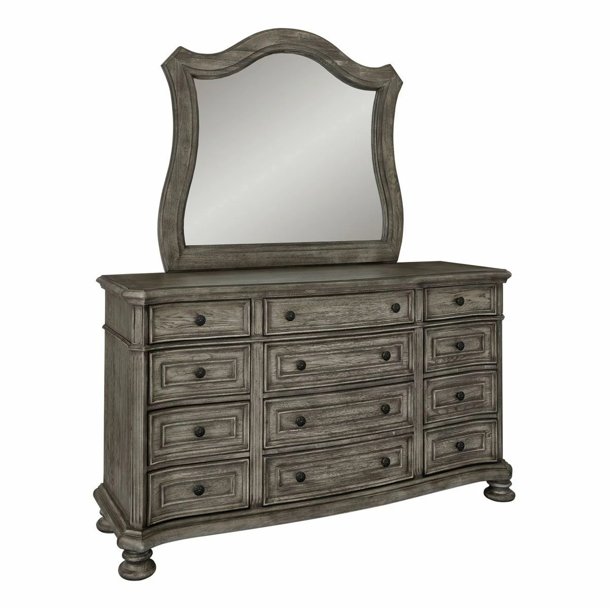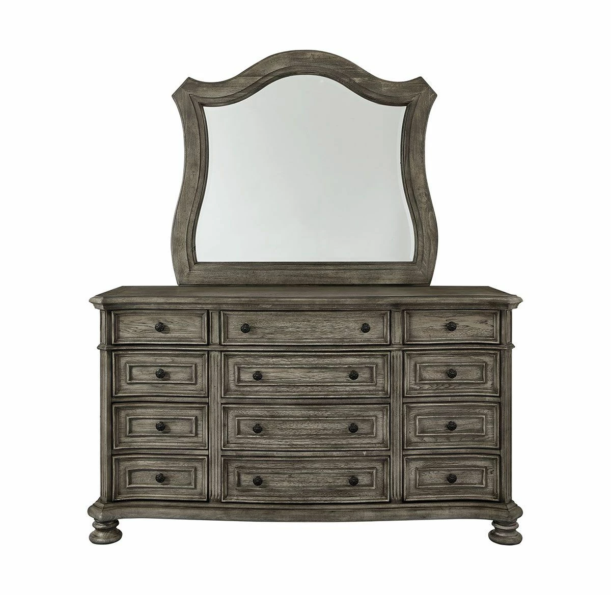 Start your day basking in traditional and modern design with this dresser and mirror set from the Carden Collection. Elegantly fluted pilasters recalling Greek columns are bathed in a sandblasted grey that easily pairs with nearly any color scheme. The dresser offers ample storage thanks to 12 drawers and a sliding velvet jewelry tray. And the mirror features a dramatically shaped frame and beveled mirror glass.