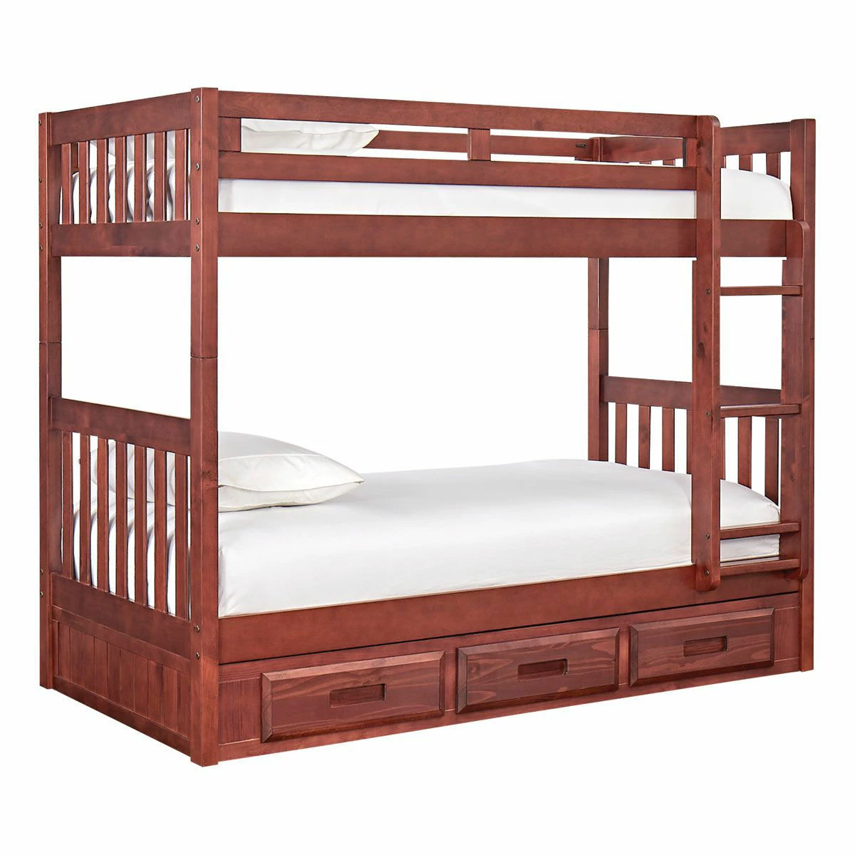 The solid wood merlot finish of this collection features many different options. This collection can be dressed up or add a more playful setting for your younger ones. Versatility is the keystone of the many pieces you can add to this collection. The Bunkbeds and Stairbed along with the Loft bed gives you all the storage needed. Options available from 3 drawers to 6 drawer under storage, bookshelves, trundles All drawers have roller guides for ease of use and durability. This Twin over Twin Bunkbed includes a Twin Trundle, other pieces sold separately.