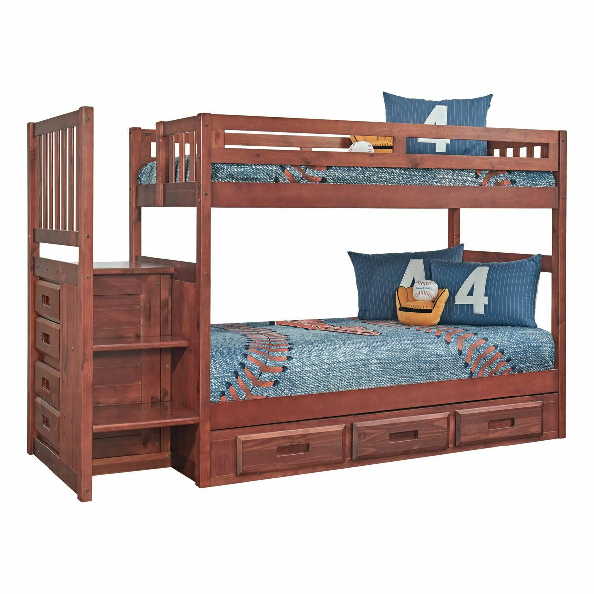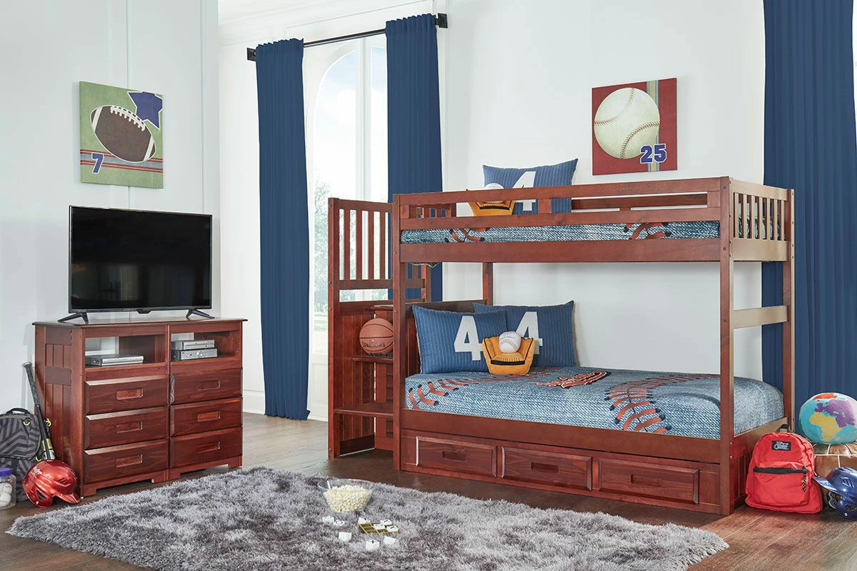The solid wood merlot finish of this collection features many different options. This collection can be dressed up or add a more playful setting for your younger ones. Versatility is the keystone of the many pieces you can add to this collection. The Bunk Beds and Stairbed along with the Loft Bed gives you all the storage needed. Options available from 3 drawers to 6 drawer underbed storage, bookshelves, trundles. All drawers have roller guides for ease of use and durability. Twin over Twin Stairbed, other pieced sold separately.