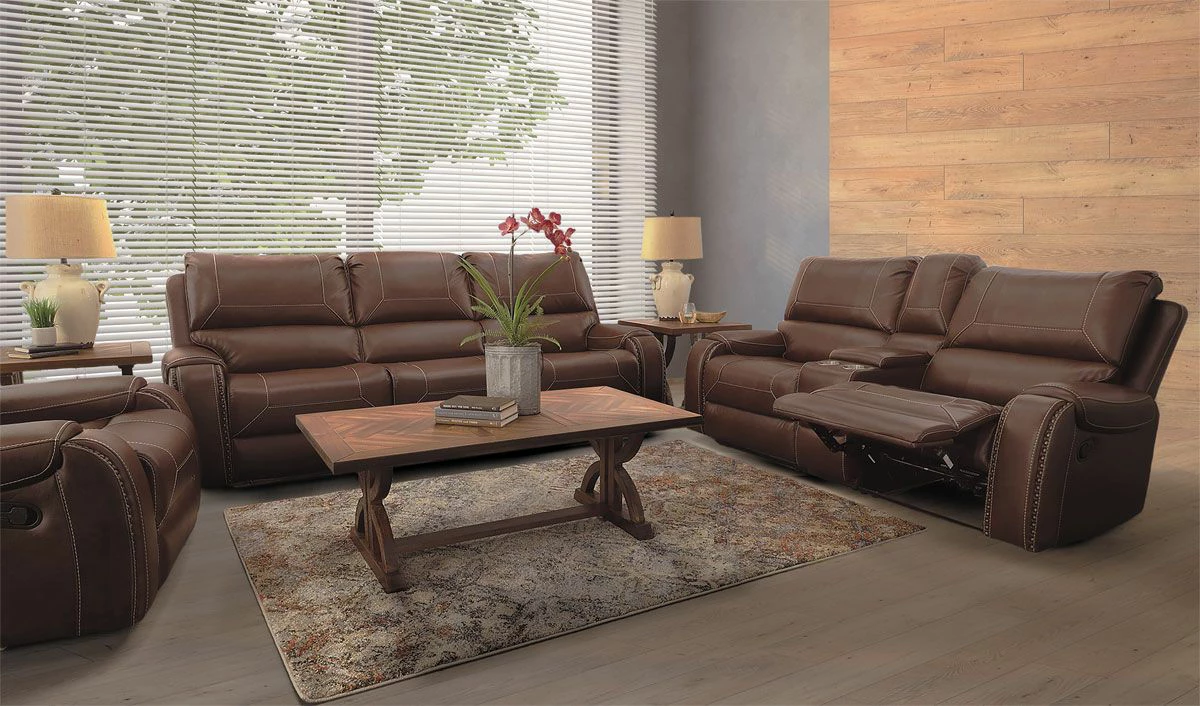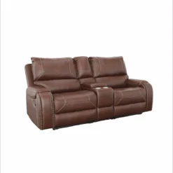 Your seating options are unlimited with the ‘Conquest Saddle’ modular, reclining living room collection. Looking for an oversized sectional for your great room? What about a console loveseat and matching recliner for your home theater room? The ‘Conquest Saddle’ collections allows you to build your sofa, loveseat or sectional to the exact dimensions to best fit your room. Upholstered in a saddle brown fabric, the collection is finished off with saddle-bag-style arm treatments and hand-applied nail-head trimming.
