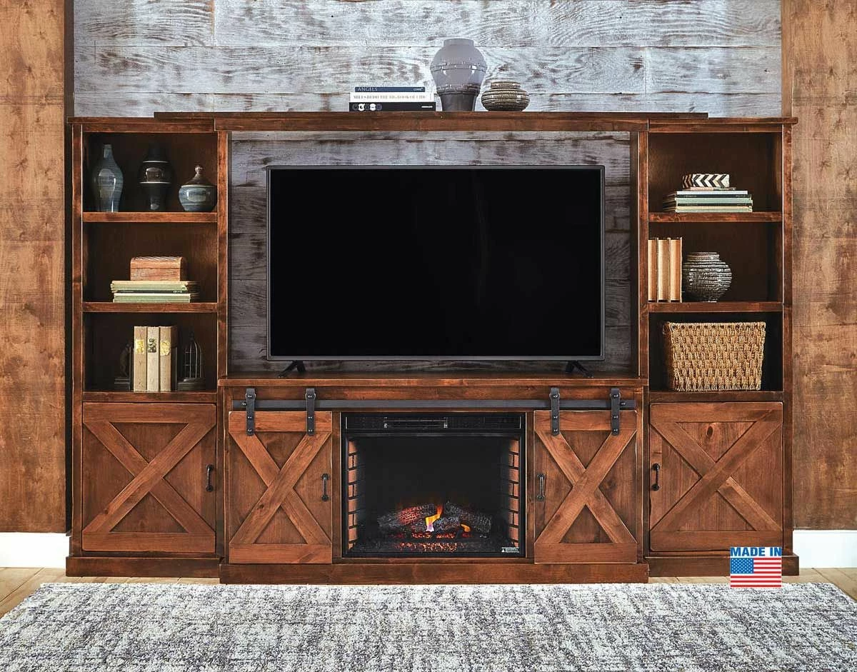 Wildly popular, warehouse or barn style doors have become a staple in many homes across America. Reminiscent of simpler times, their appeal is understandable and undeniable. The TV console fireplace features functional forged iron hardware and rolling doors. Bring “The Look” home today with Farmhouse.