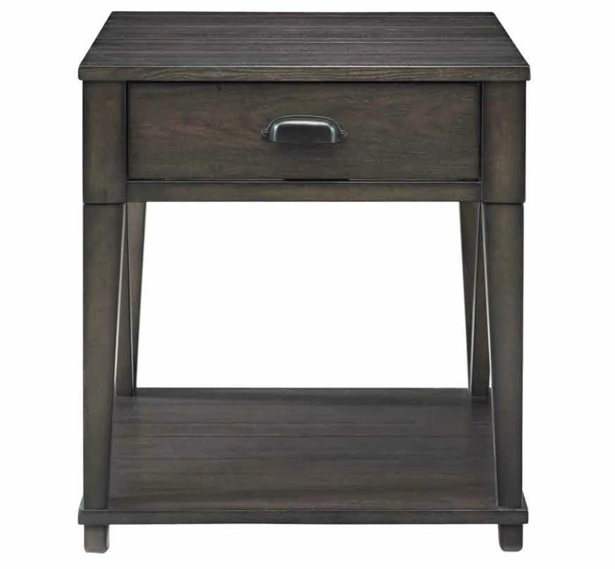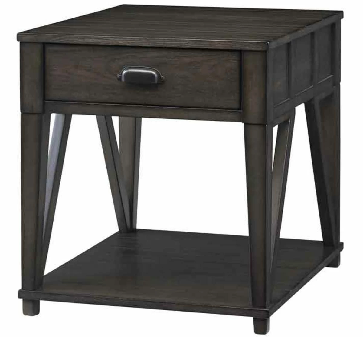 Mix things up with this rectangular end table that comes in a fashionable midnight grey color. It features a handy top storage drawer with metal drawer guides and an open component storage area, great for books or accessories. It is crafted from poplar solids and oak veneers with solid poplar side stretchers.