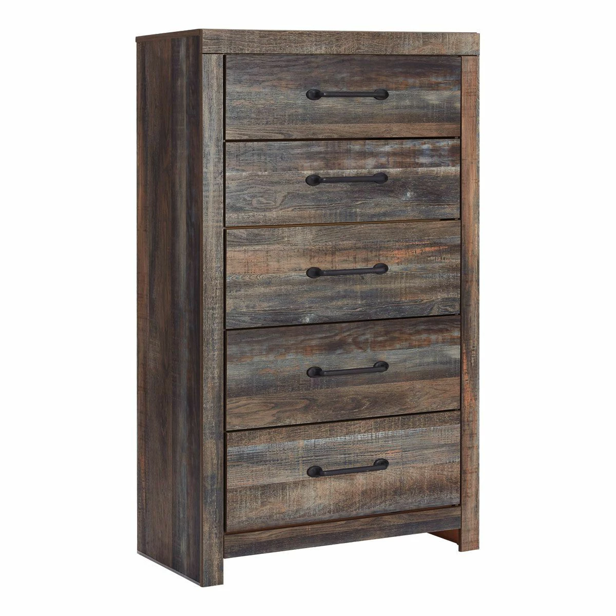 With the ‘Grinnell’ master bedroom collection you are invited into two separate style categories. This groups features the perfect blend of rustic design elements complimented beautifully by industrial accents. Laminate with replicated wood grain over engineered wood construction. Dark-tone, industrial style hardware. The collection is highlighted by (2) retro-chic light sconces adorning the headboard, perfect for reading in bed. The suite features a weathered chocolate brown finish.