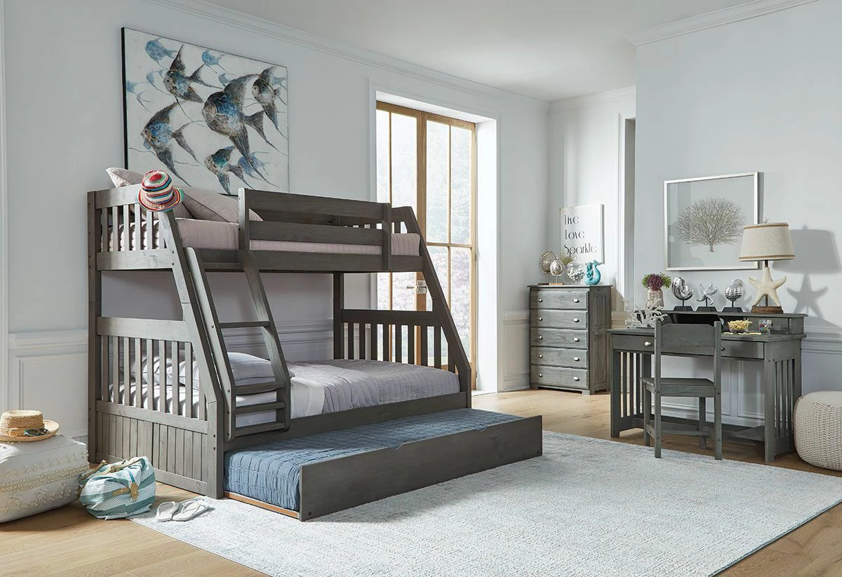 The Harley Collection bunk bed comes with built-in ladder, guard rails and optional under bed three drawer storage or twin trundle bed. Its charcoal grey finish will easily weather changing trends, and the top bunk can be removed and used separately, giving you two standard Twin beds. Throw in the rest of the Harley Collection and give your child the best-looking room in the neighborhood. Twin over Full Bunk Bed with Trundle, other pieces sold separately.