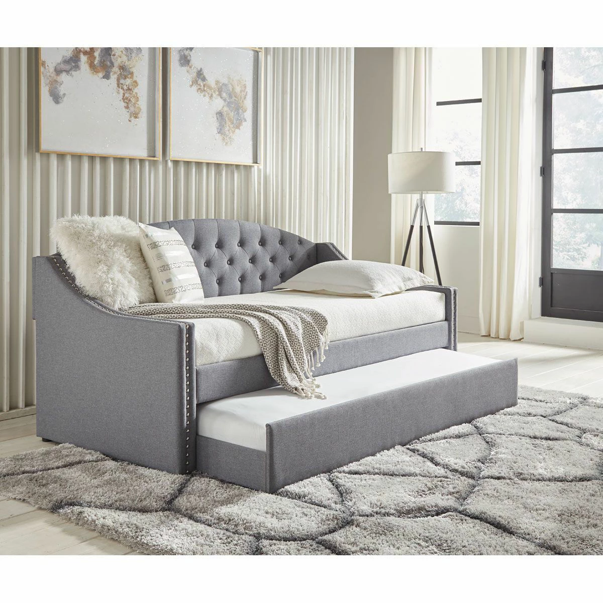 This Twin Daybed is designed with the modern traditional home in mind. Designed to use as a bed or a cozy relaxation nook, it features a trundle that provides the extra space that you need for overnight guests. Covered in a neutral toned fabric, along with curved arm panels complete the traditional look. This group includes daybed and trundle.