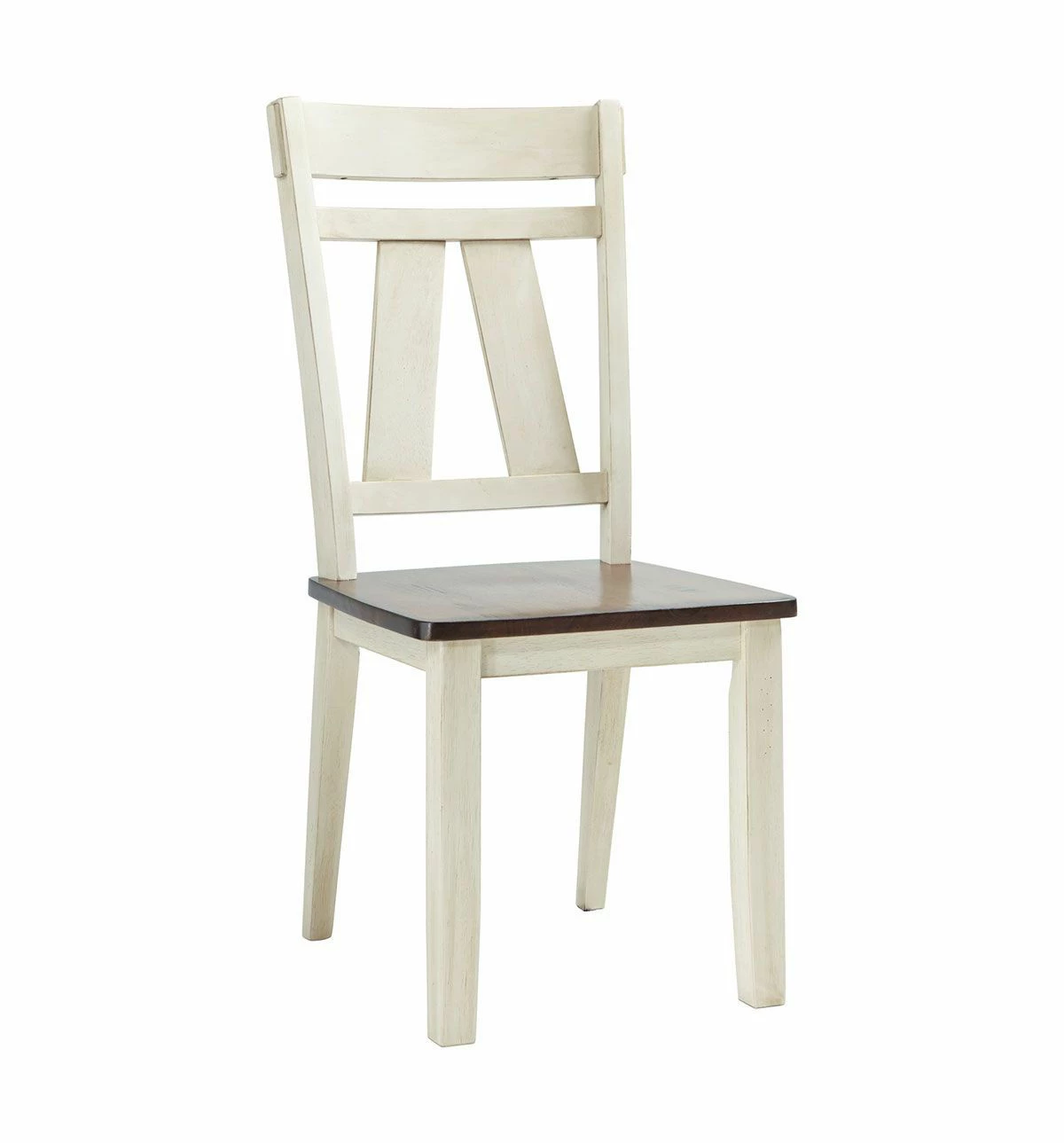 Sit down and rest on these rustic beauties. This chair has a farmhouse casual style. Itβs made of solid wood and features a two-tone finish with a splat-back design to complement the matching table.