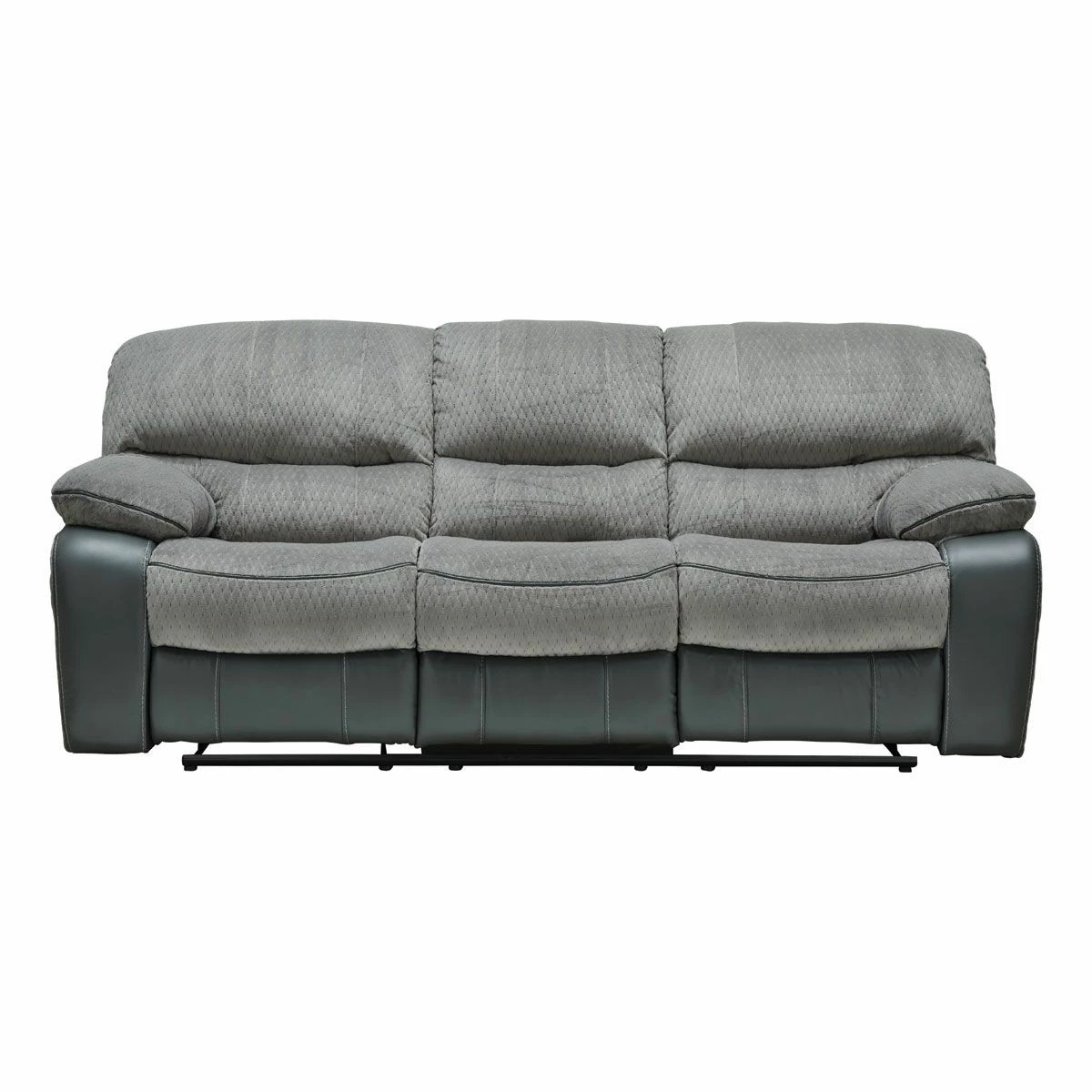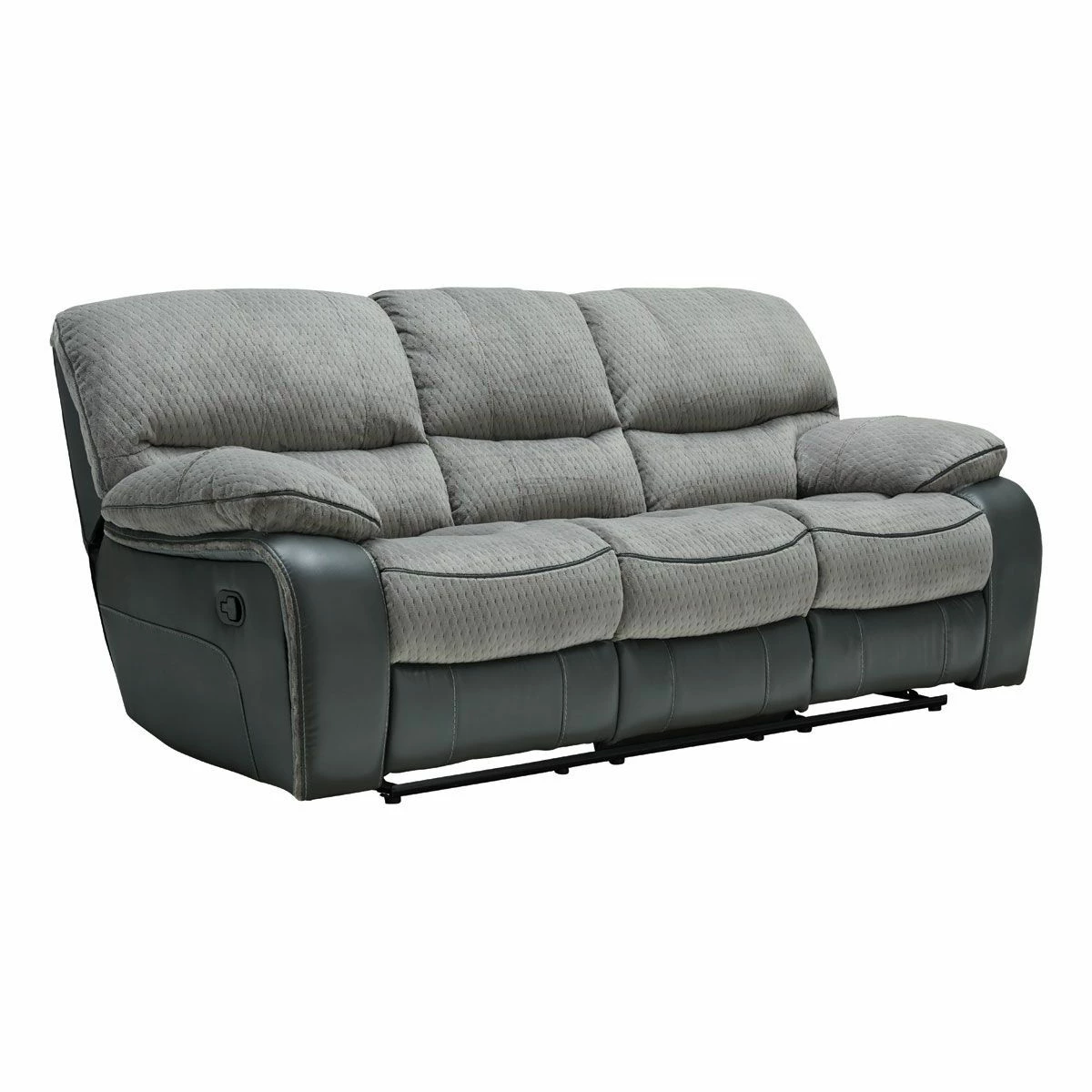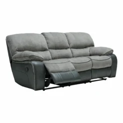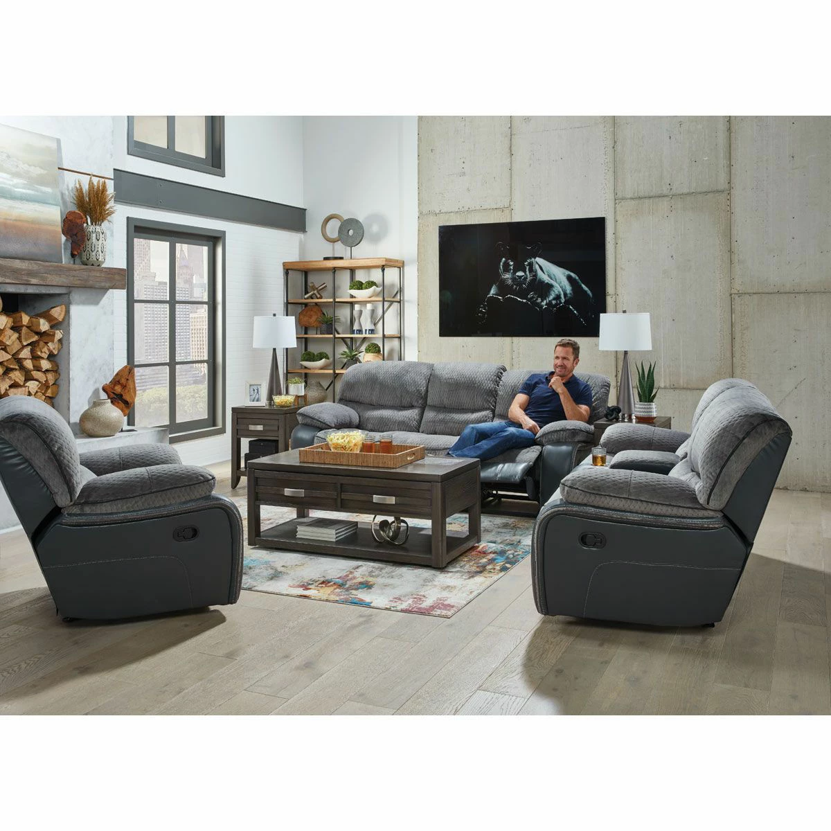 Relax in comfort with the body contoured cushioning of the ‘Lawson’ Reclining Living Room. Enjoy the great look of leather with the easy care of Microfiber. Pub seat backs with contoured bucket seats and lower lumbar support designed with your body shape in mind. A fresh color palette features a two-tone design with a light heather grey fabric accented with a deep charcoal blended fabric exterior. Contrast welting adds an eye-catching detail.