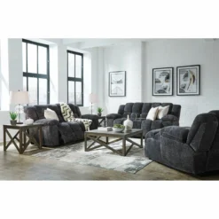 Your relaxation time just got cozier than ever! The Lockley reclining living room features over-stuffed ‘Super-Biscuit’ seat and back cushions to give you maximum comfort. Featuring dacron-wrapped, high-density, solid-block foam cushions, heavyweight yet ultra-soft chenille fabric in a Charcoal Grey. The frame is 5-layer, industrial strength plywood for stability and strength. Pieces available in this collection are Power Reclining Sofa, Power Reclining Console Loveseat and Power Reclining Chaise. Additional pieces available: Manual Reclining Sofa, Manual Console Reclining Loveseat, Manual Reclining Chaise Lounge and Corner Wedge allowing for the creation of a 3-Piece Sectional. Made in the U.S.A.!!!