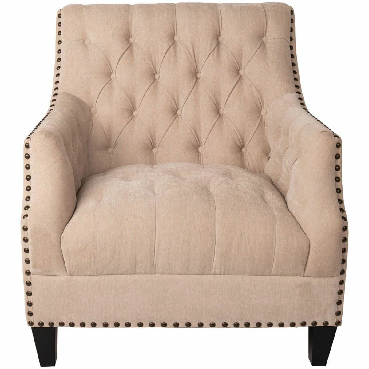 The diamond tufting and shaped arm detail make the Meridian Accent Chair the ideal addition to any room in the home. This armed accent chair is adorned with bronzed nail heads surrounding the exterior frame. Founded atop of tapered legs and finished in a dark wood tone.