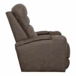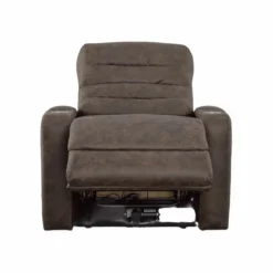 The Orion Dual Power Recliner is the ultimate in comfort featuring casual contemporary styling. Upholstered in a durable, family-friendly polyester fabric, this recliner boasts a power reclining chaise footrest and headrest. Both arms have stainless steel cupholders and hidden storage compartments to keep your essentials within reach. The horizontal channeled back adds to the comfort and support of this stylish recliner. Available in Slate Grey or Coffee Brown to complement any décor.