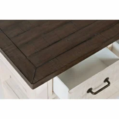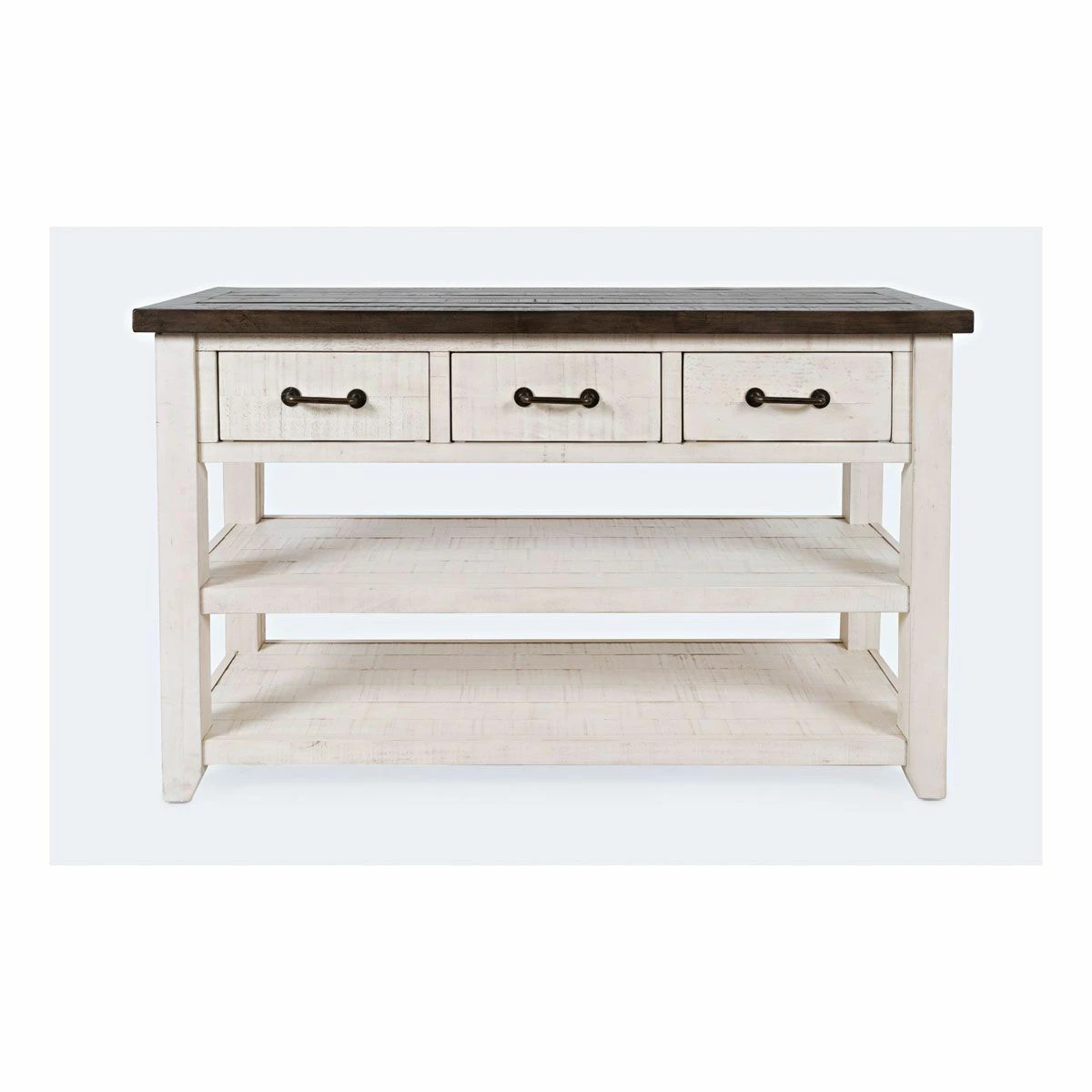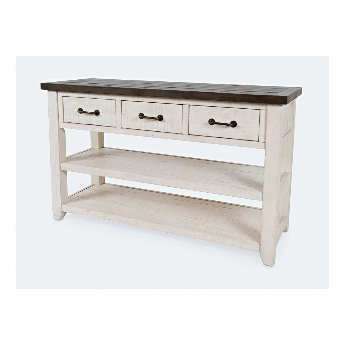 This Park View two toned vintage white console/media table has 3 drawers, and two shelves. This table combines a rustic feel with a natural style.