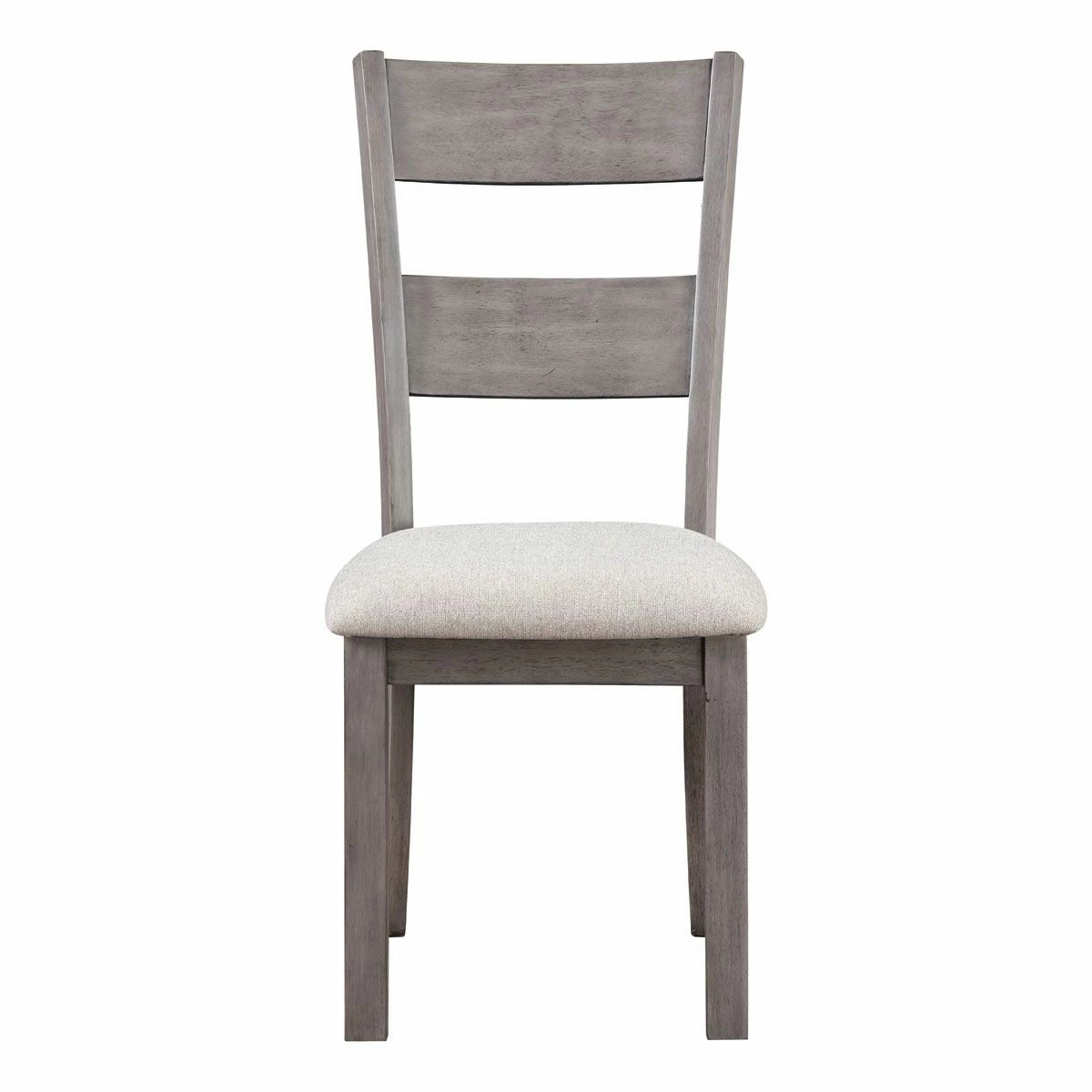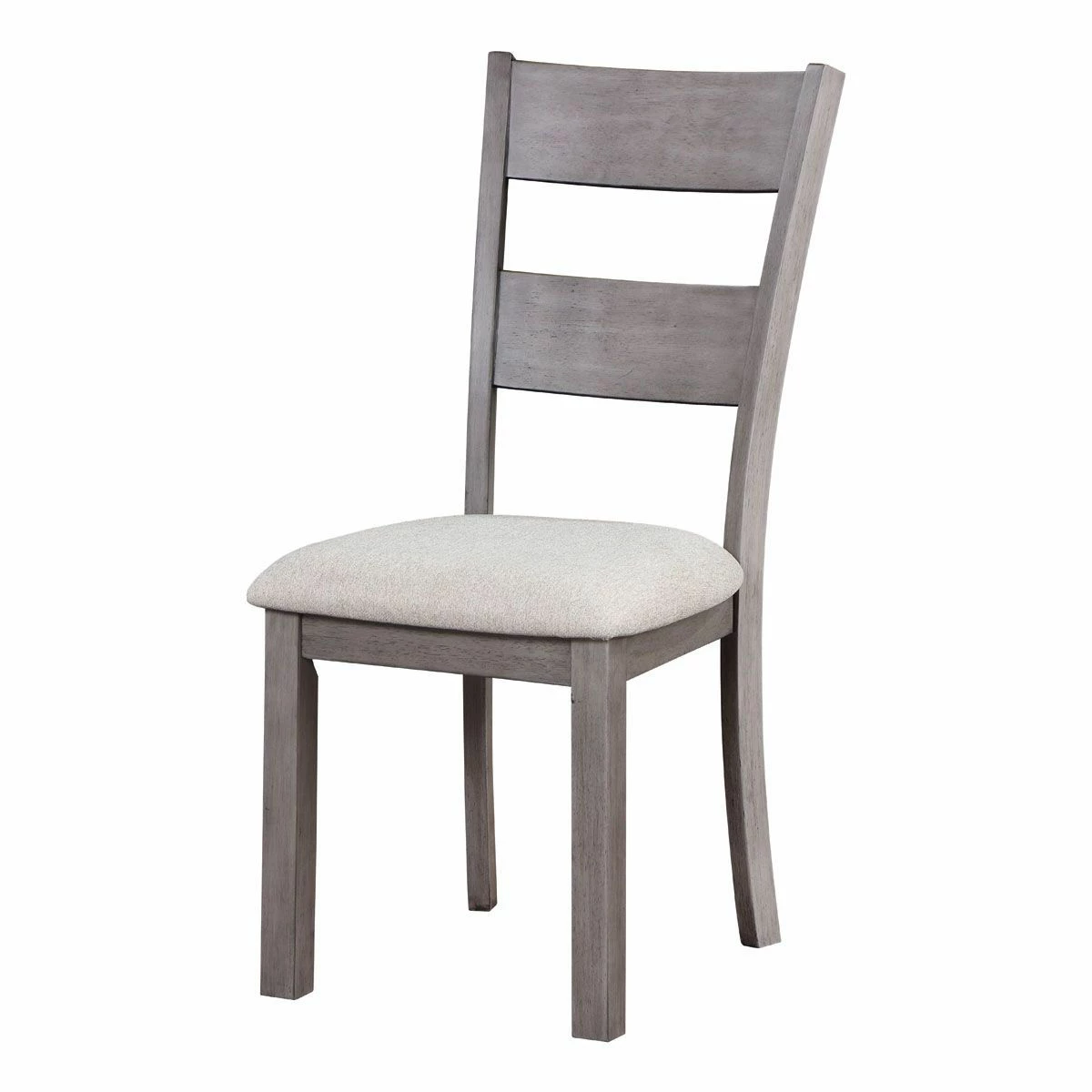 The Pine Hills side chair has a slat back with clean lines to accent the table and the light grey fabric on the seat goes with any décor.