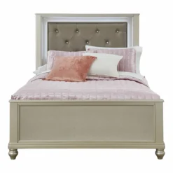 Reminiscent glam bedroom design in these youth bedroom collections, with embossed pattern design on back panel that enhances with LED back light on headboard turn the entire bed in to whimsical feeling. Sumptuous strips details added on case pieces synchronize the bed crystallite feeling. Bolt handle design with crystal-like pattern is added on drawer handle to complete the modernize look, which operated with ball bearing glide for maximum drawer opening. In additions each case pieces of Nightstand and Dresser case, has a hidden drawer to store yours kids magical keepsake. Full bed only, other pieces sold separately.