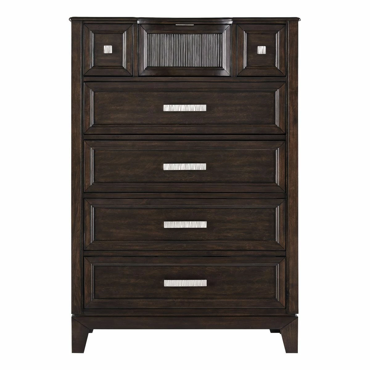 The “Roman” storage bedroom collection blends subtle contemporary details with highly durable construction. Finished in a warm Tobacco Brown, the “Roman” suite is composed of Poplar Hardwood Solids and Birch Veneers. Some additional features to this collection are storage footboard drawers, reeded accents, brushed nickel bar hardware, concave accent drawers and starburst veneer patterning. Available in Queen and King sizes.