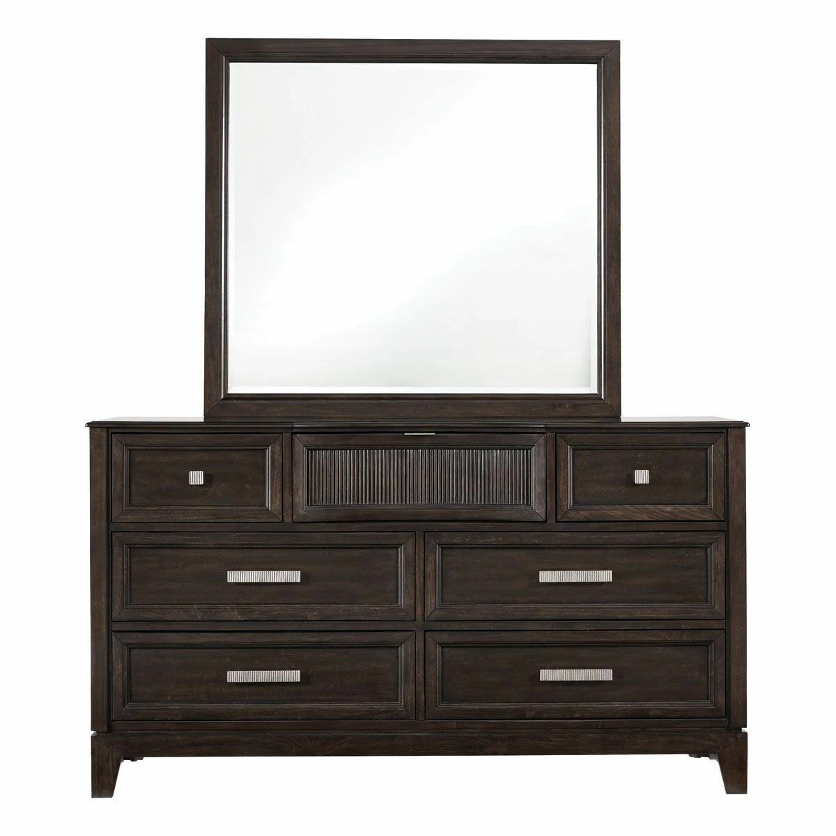 The “Roman” storage bedroom collection blends subtle contemporary details with highly durable construction. Finished in a warm Tobacco Brown, the “Roman” suite is composed of Poplar Hardwood Solids and Birch Veneers. Some additional features to this collection are storage footboard drawers, reeded accents, brushed nickel bar hardware, concave accent drawers and starburst veneer patterning. Available in Queen and King sizes.