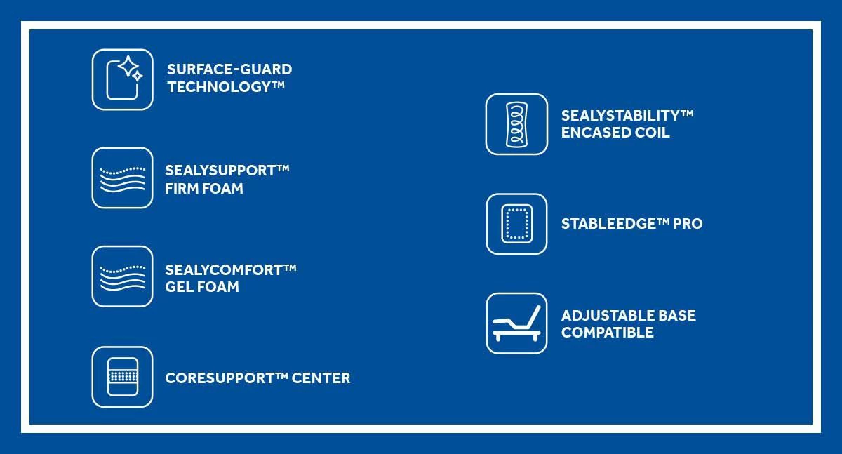 The Sealy Century Collection Hanson features targeted support for your back and core with a precisely engineered coil system and Sealy gel foam to promote proper alignment. The plush knit cover closest to the body allows extra comfort using a super-soft stretch and breathable quality quilted fabric. Maximizing support for your whole body this mattress features the Sealy stability encased coil system. These individually wrapped coils reduce motion transfer so you feel less movement from your partner throughout the night. The Sealy core support system using Sealy comfort gel foam provides support under the heaviest part of your body where you need it most in the center third of the mattress. Our stable edge pro system feature delivers a reinforced coil border that surrounds the edge of the mattress providing a more usable sleeping surface. This group includes King mattress and 2 Twin XL foundations.