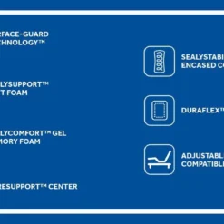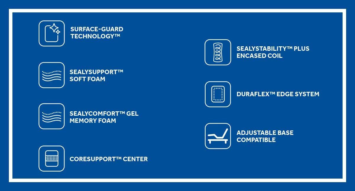 The Sealy Signature Century Collection Stockwell features targeted support for your back and core with a precisely engineered coil system and Sealy gel foam to promote proper alignment. The plush knit cover closest to the body on the top allows extra comfort using a super-soft stretch and breathable quality quilted fabric. Maximizing support for your whole body this mattress features the Sealy Stability Plus encased coil system. These precisely-engineered individually encased coils reduce motion transfer so you feel less movement from your partner throughout the night. The Sealy Core Support System using Sealy Comfort gel foam provides support under the heaviest part of your body where you need it most in the center third of the mattress. The Dura Flex Edge Pro System feature delivers a reinforced coil border that surrounds the edge of the mattress providing a more usable sleeping surface. Also featured are 4 vertical handles for easy transfer or rotation of the mattress. This group includes King mattress and Legends Signature adjustable base.