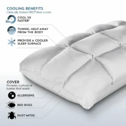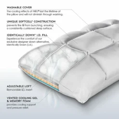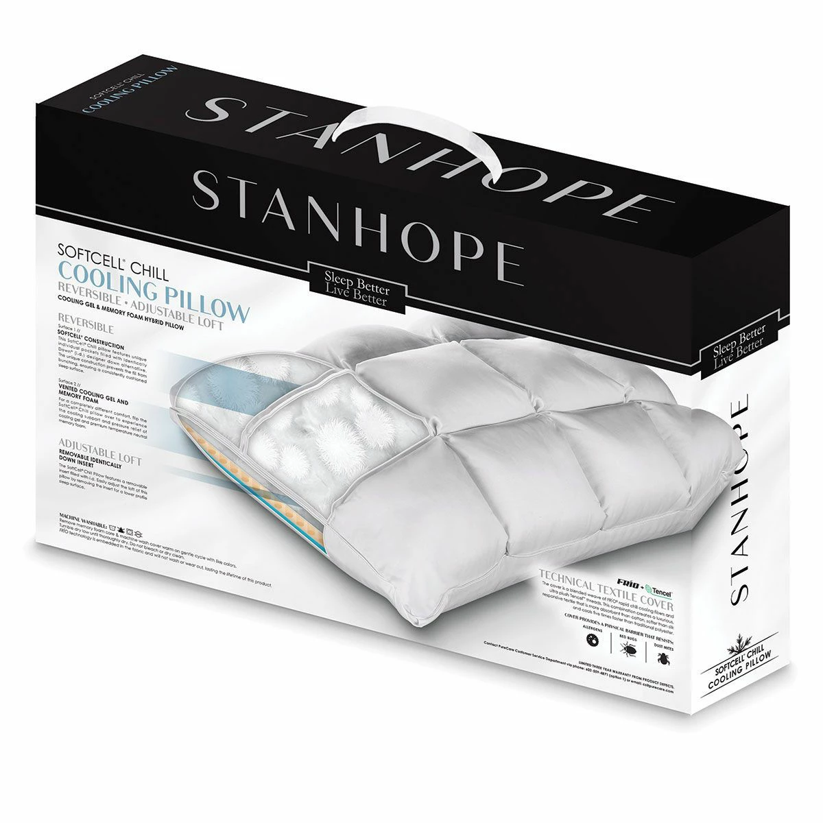 Stanhope Frio Pillow has a cover that cools 5x’s faster and tunnels heat away from the body, which also provides a cooler sleep surface. The cooling effects of the Frio’s last the lifetime of the pillow and will not diminish through washing, the soft cell construction prevents the fill from bunching ensuring a consistent sleep surface. The Stanhope pillow also has an adjustable loft to ensure personal comfort while providing a physical barrier that resist Allergens, Bed Bugs and Dust Mites.