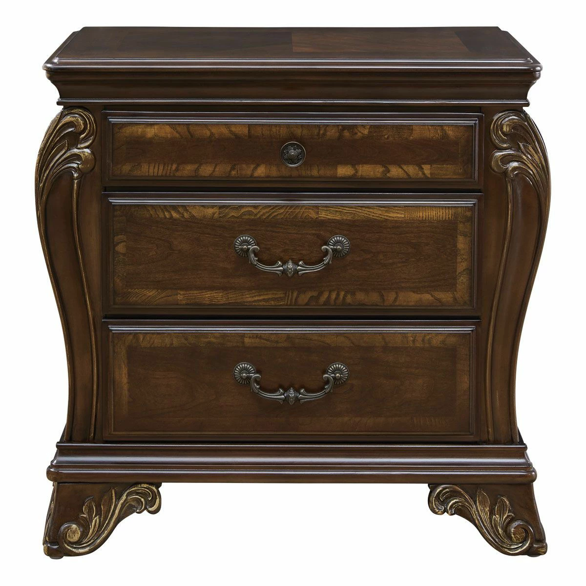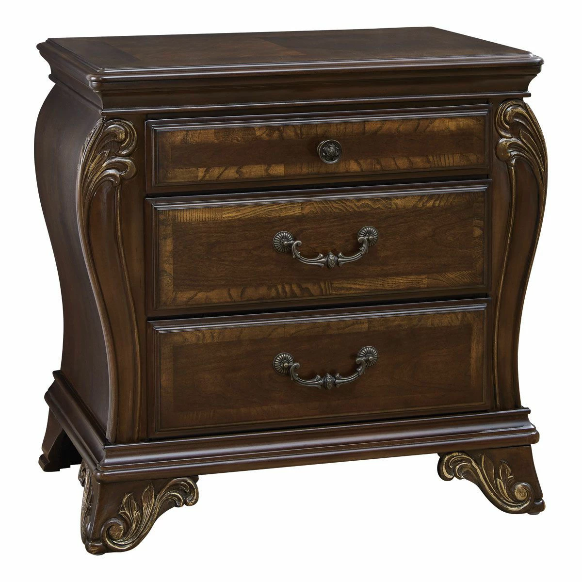 Opulent luxury comes home. The Valencia bedroom brings timeless design elements from yesteryear into today. Crafted using hand-laid Cherry and Olive Ash Burl wood veneers, the suite is composed of Poplar hardwood solids. The Bombay-style shaping gives the group the look of elegance and traditional beauty. Dovetail drawer construction, felt lining on all top drawers and full-extension drawer glides bring function and durability to this collection.