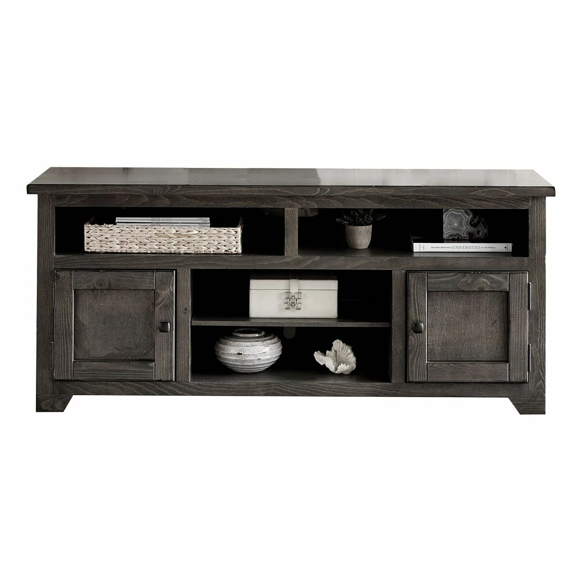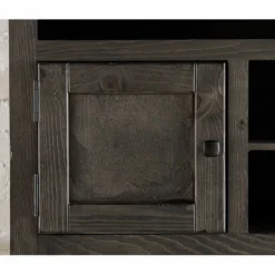 The Vineburg 60” console features two open compartments at top, two doors with one adjustable shelf behind each door, center compartment has one adjustable shelf, grommets for wire management. Multi-step hand applied storm finish. Straight framed molding doors, canted foot base. Cutouts for component cables. Dark antique brass square knobs.
