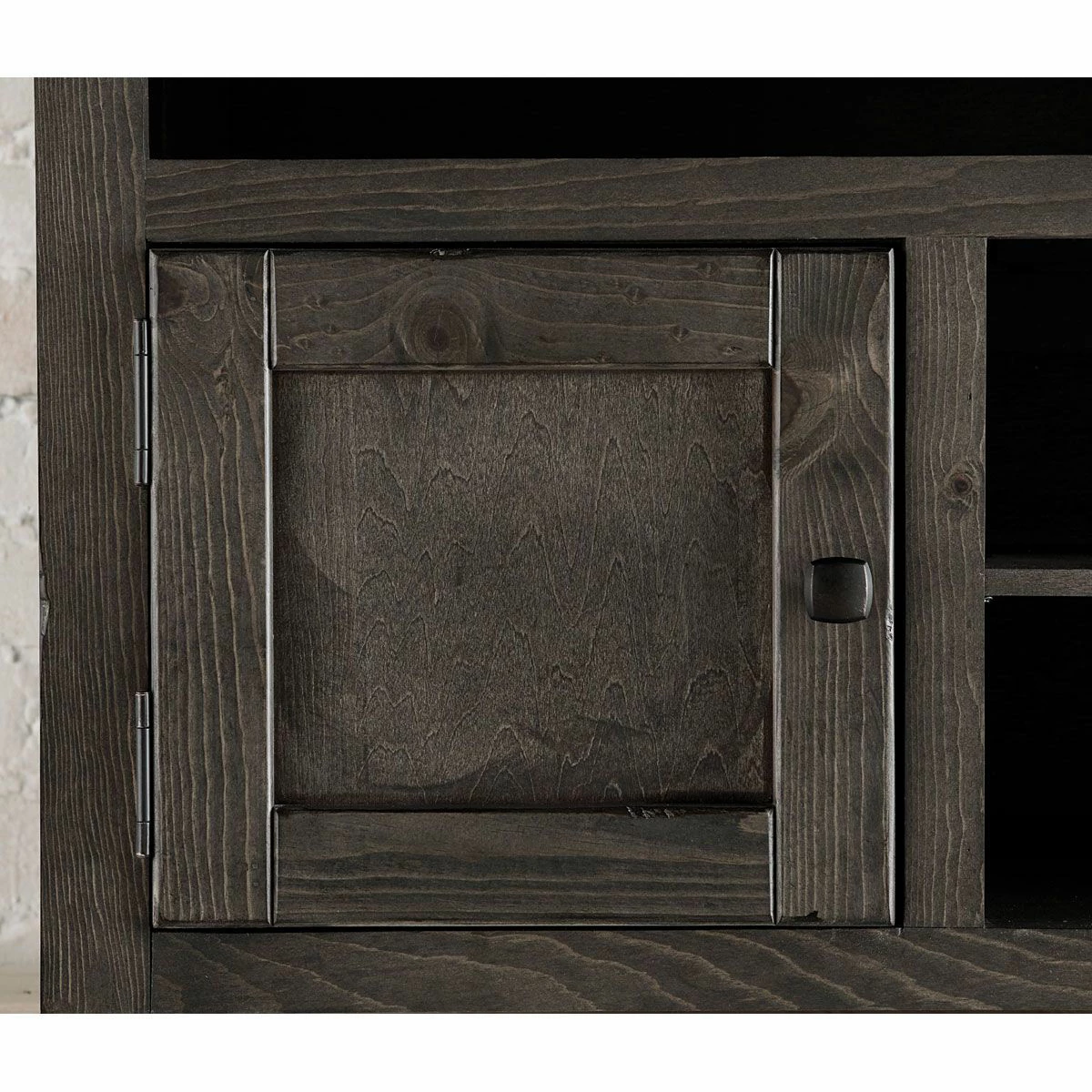 The Vineburg 70” TV console features three open compartments, below are two doors with an adjustable shelf, to the sides are open compartments with an adjustable shelf, grommet for wire management. Multi-step hand applied storm finish. Straight framed molding doors, canted foot base. Cutouts for component cables. Dark antique brass square knobs.